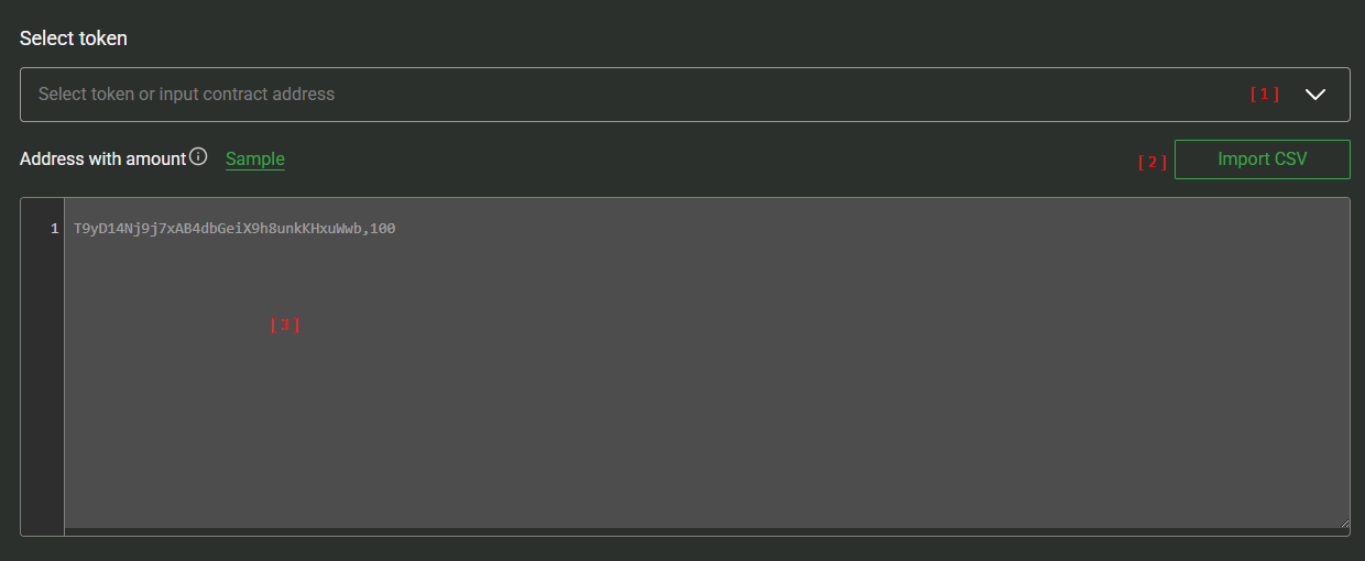 Choose token [ 1 ], upload CSV [ 2 ], and verify the preview [ 3 ].