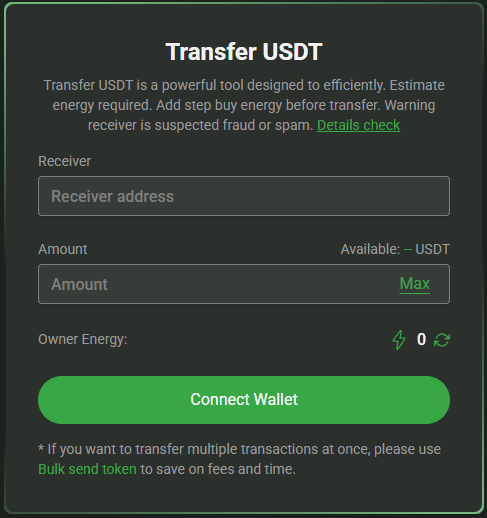 The **Transfer USDT** tool allows users to send USDT securely and with optimized transaction costs on the TRON network.