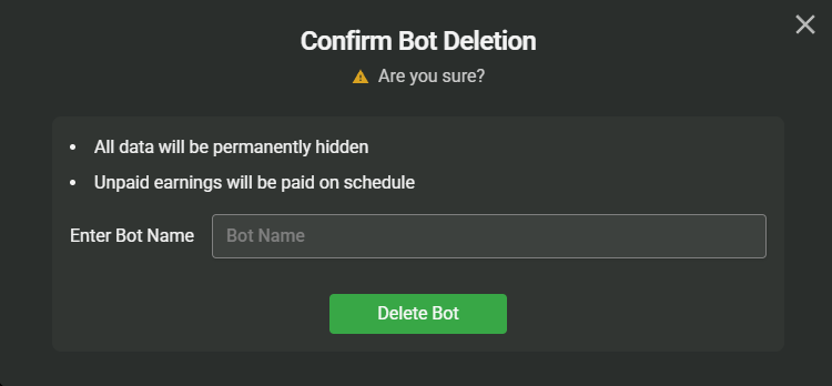 Enter the bot's name to confirm, then press the Delete Bot button again.
