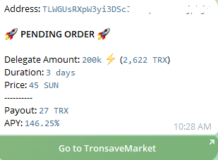 * When you click the "**Go to Tronsave Market**" button, the system will automatically redirect you to the order details page. There, you can connect your wallet and manually proceed with the sale.