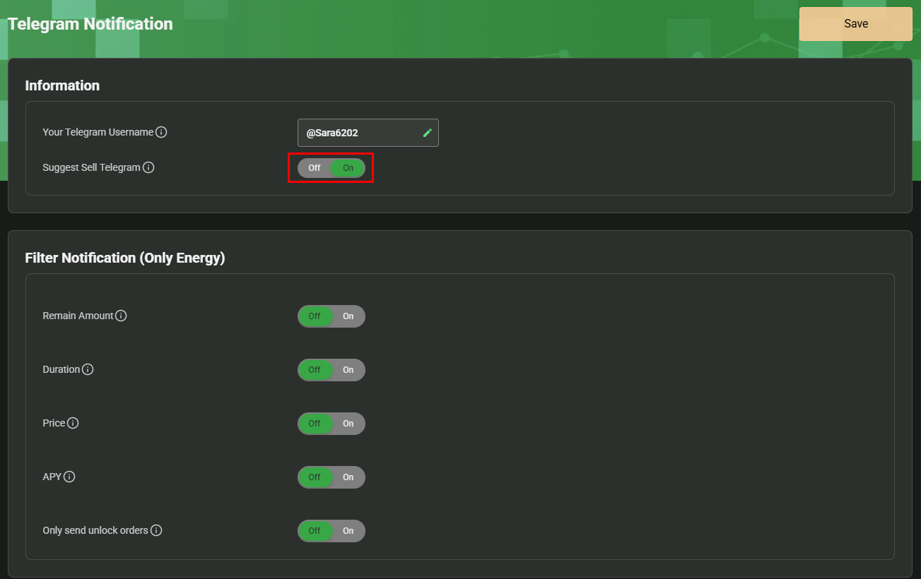 * After completing the setup, turn **ON** the Suggest Sell Telegram feature to view the available filters you can configure.
